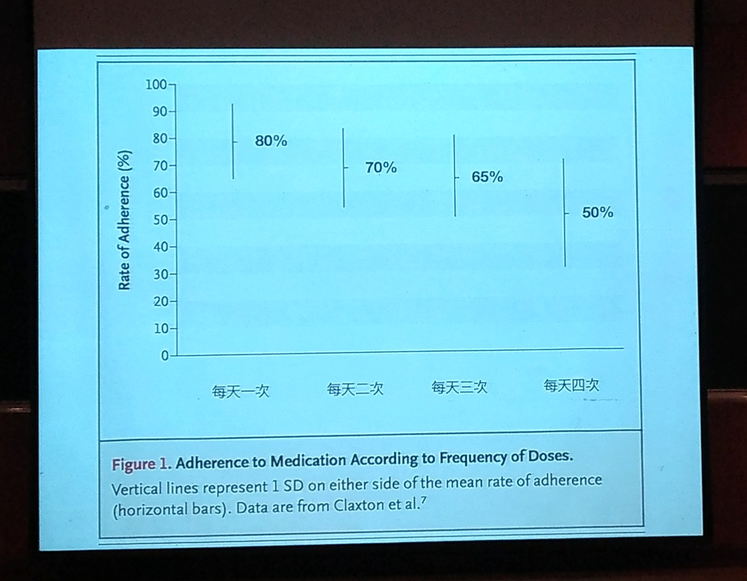 根據統計,每天吃1次的藥,病人依從性大約80%,看起來還可以接受,但隨著服藥頻次的增加,依從性當然是愈來愈低,如果是一天吃3次的藥,依從性就只剩下65%,看起來還不錯嗎?事實上這表示超過三分之一的病人都沒有按時吃藥了!